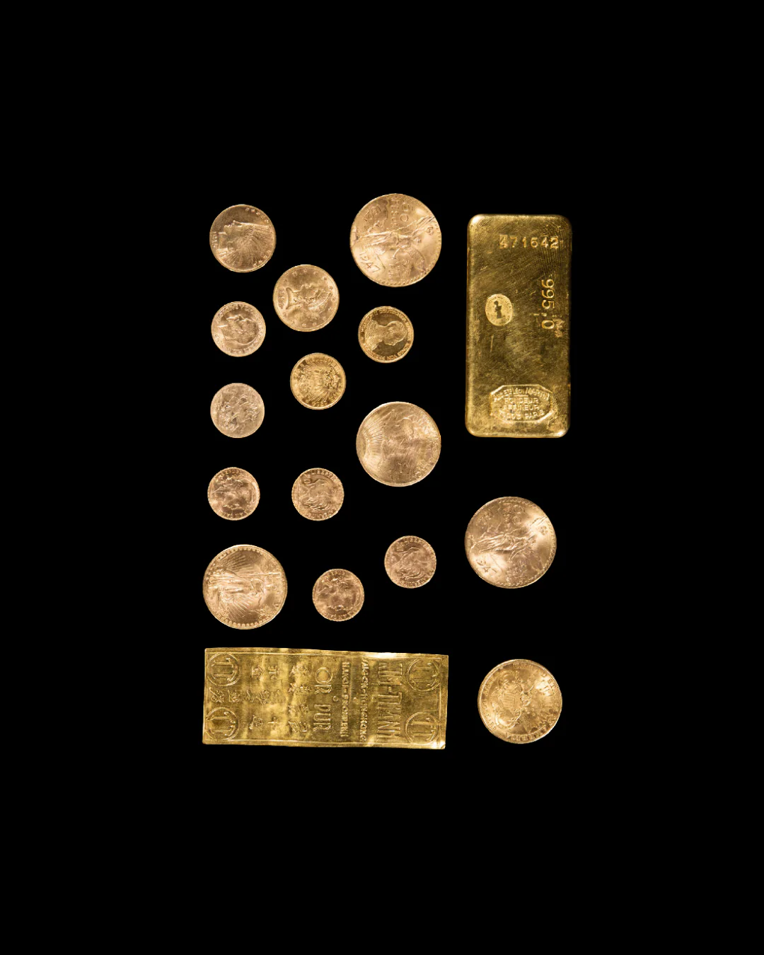 • Monnaies en or : Napoléons (Louis d’Or), pesos mexicains, dollars américains, souverains britanniques, florins néerlandais, marks allemands, pièces de 20 francs tous pays, Monnaie de Paris